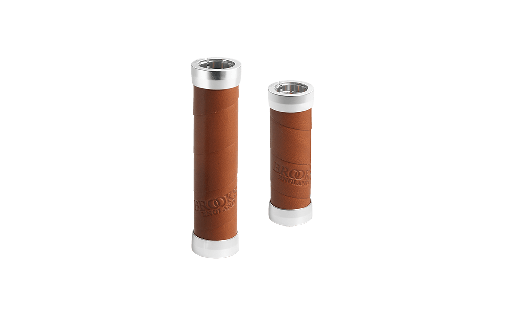 Gripy, které spíše než gripy vypadají jako omotávka. Ta je v tomto případě natočená na hliníkovém těle, které je velice pevně přimontováno k řidítku pomocí dvou objímek. Celkově je grip lehčí než jeho starší kolega z kožených kroužků. Celkové provedení je samozřejmě maximálně precizní tak, jak bývá u Brooksu běžné. O neuvěřitelných detailech nemluvě.