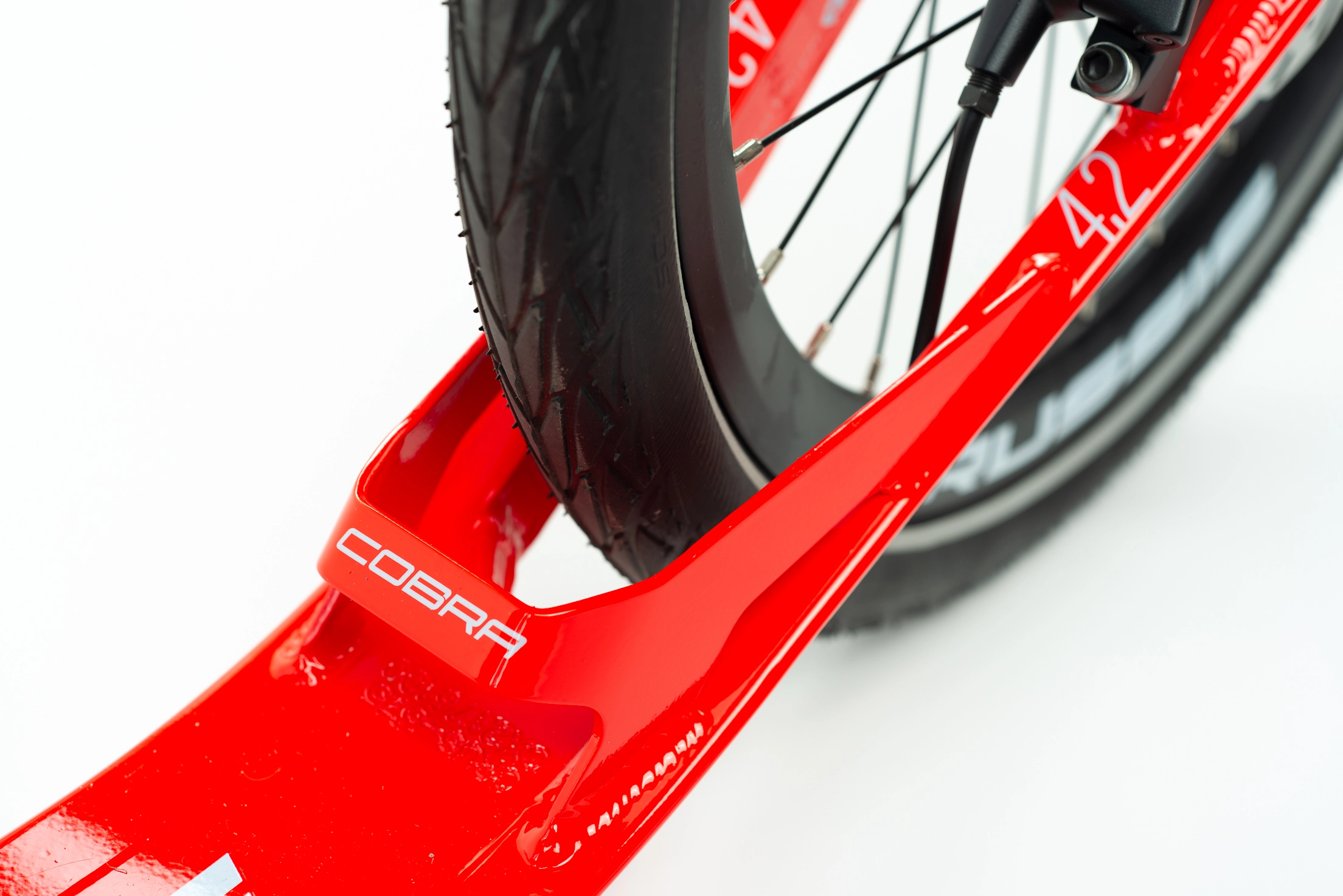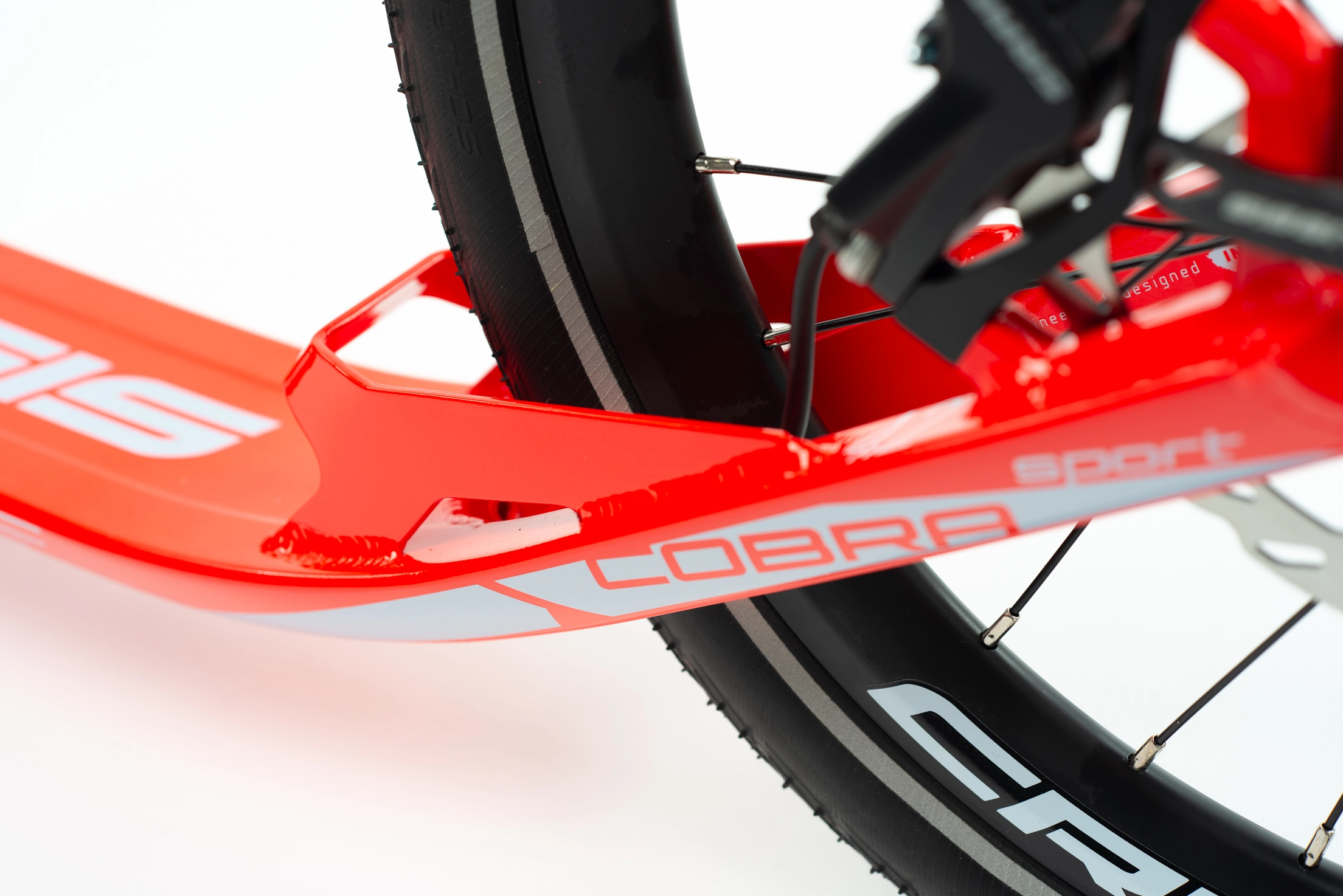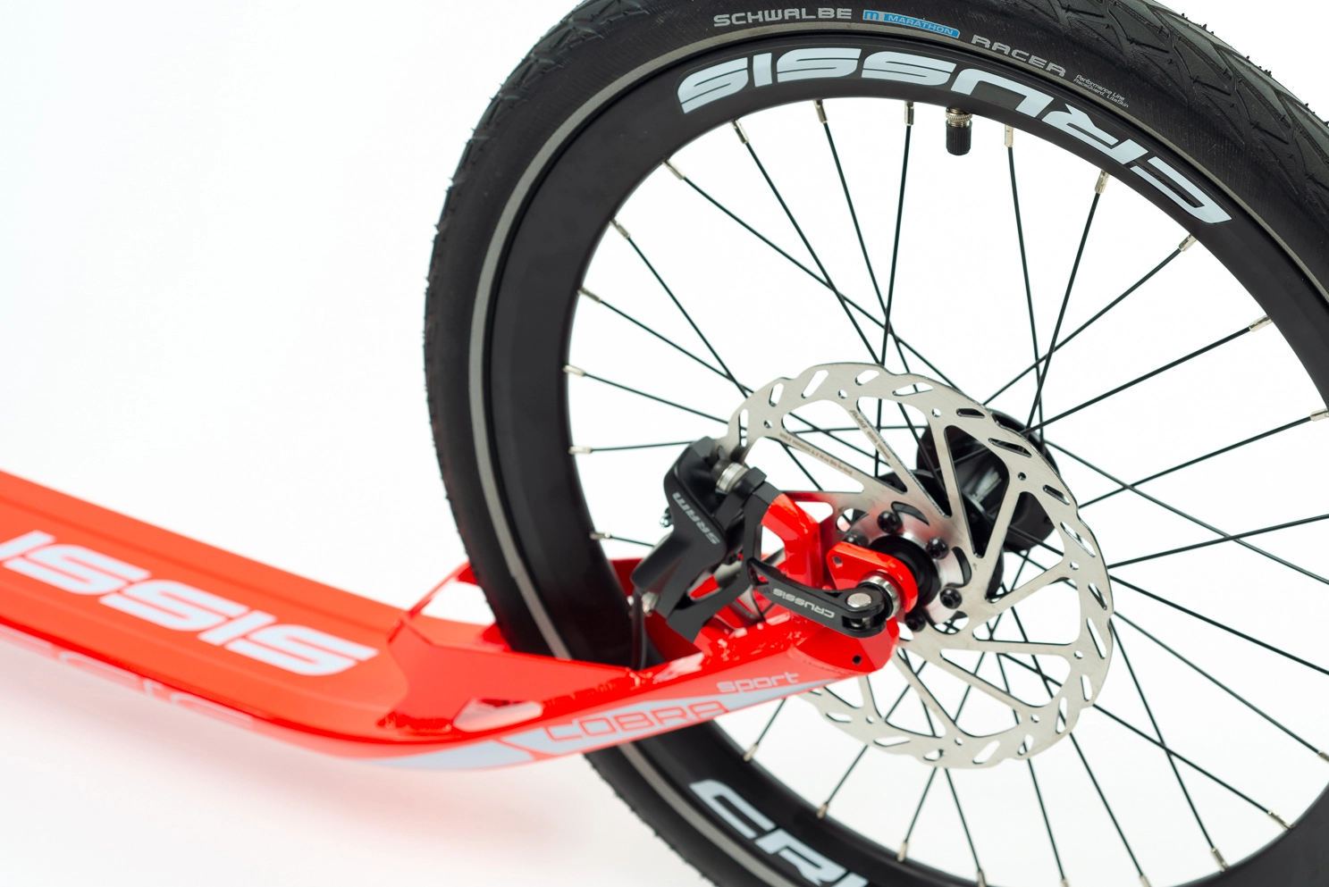 Hliníková koloběžka COBRA Sport od CRUSSIS na špičových kotoučových hydraulických brzdách SRAM s průměrem kol 26“×20“ a hmotností 8,650 kg. Koloběžka je ideální pro akční jezdce do kopcovitějšího terénu, má podstatně lepší brzdný účinek.