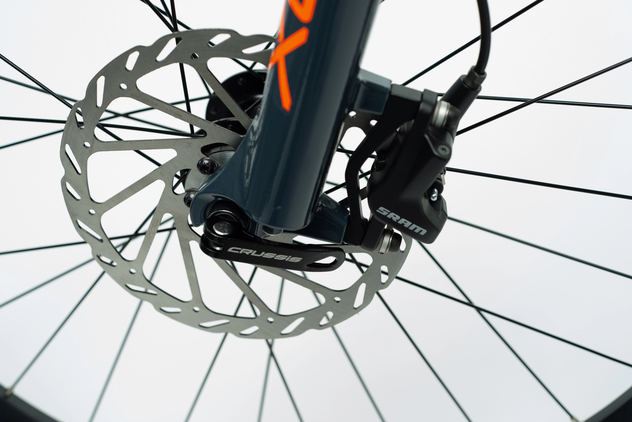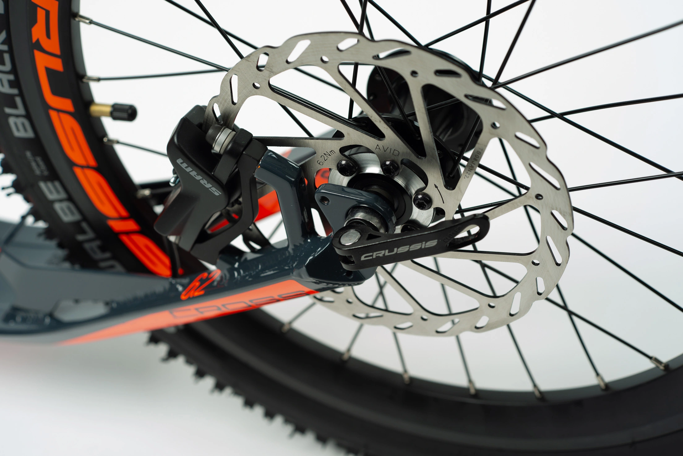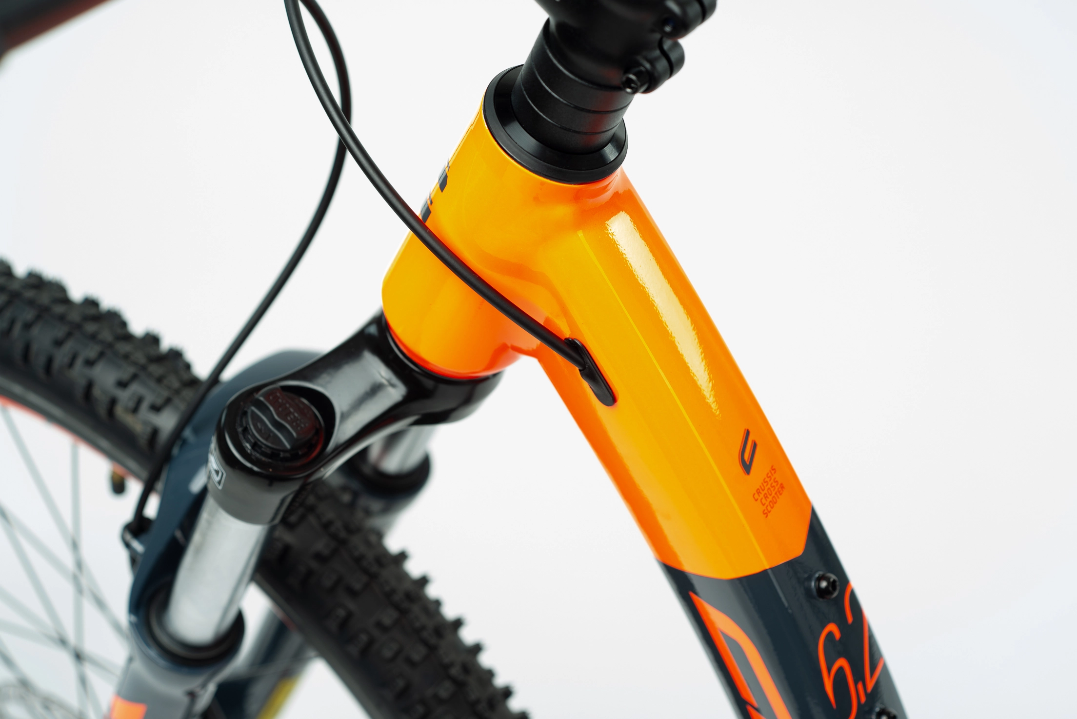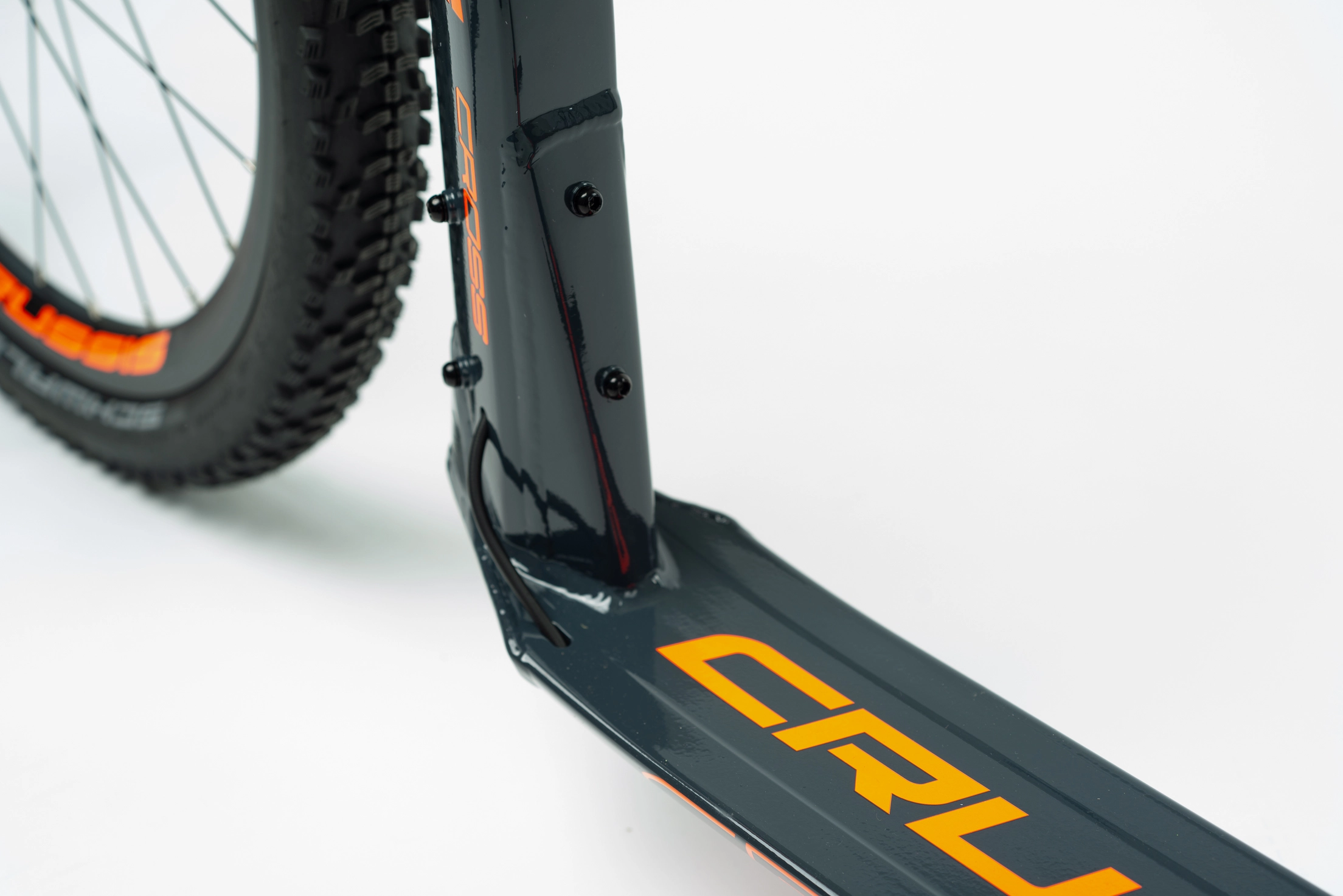 Hliníková koloběžka do terénu CROSS 6.2 na špičkových kotoučových hydraulických brzdách SRAM s průměrem kol 26″×20“, hmotností 10,870 kg, odpruženou vidlici SUNTOUR a na MTB pláštích SCHWALBE. Koloběžka je ideální do náročnějšího terénu na sjezdy či akční jízdu se psem.