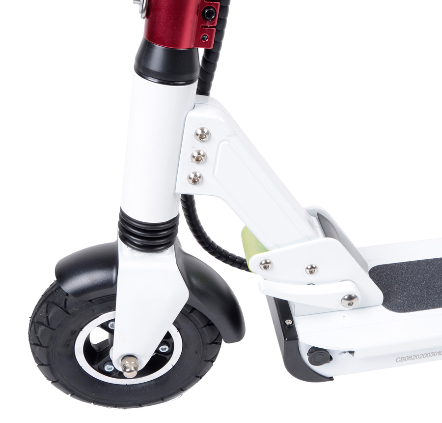 Pneu s průměrem 8″ (přední nafukovací, zadní pevné) snadno překonají i drobné nerovnosti. Odolný přední a zadní tlumič snižuje nepříjemné vibrace během jízdy. Kola jsou chráněna blatníky.