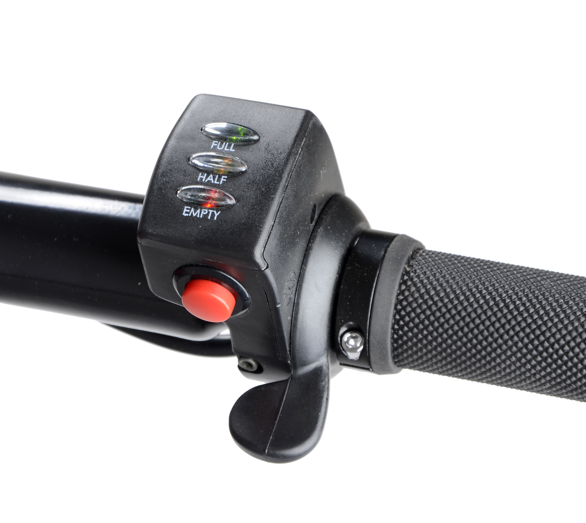 Po přepnutí bezpečnostního vypínače je kolečko okamžitě připravené na práci. Otočením plynové páčky směrem dolů aktivujete plynule motorovou dopomoc. Stiskem červeného tlačítka na plynovém ovladači přepnete motor na zpětný chod, což využijete při couvání či brzdění během jízdy z kopce.