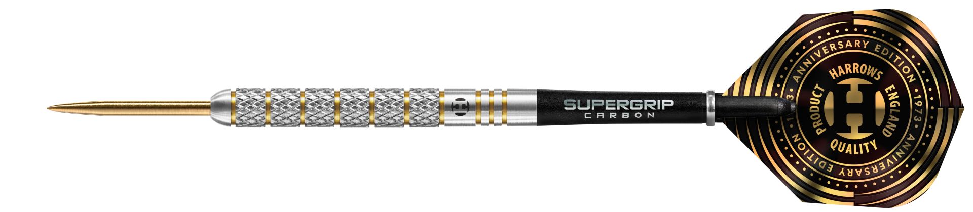 Šipky jsou doplněné karbonovými násadkami Midi Supergrip Carbon a novými jubilejní 100mikronovými letkami Harrows Anniversary, které jsou potaženy odolným zlatým nitridem titanu.