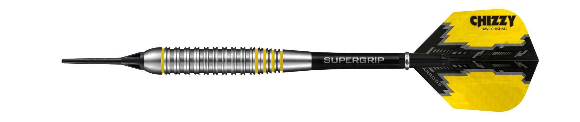 Kolekci wolframových šipek světové jedničky Dava „Chizzy“ Chisnalla rozšiřuje atraktivní řada mosazných šipek Chizzy High Grade Alloy. Ty jsou, stejně jako její wolframové protějšky, rozdělené do tří segmentů – dvojité žraločí drážky vpředu i vzadu a uprostřed dvojité ploché prstence. Nechybí ani pět kroužků v zářivě žluté Chizzyho barvě.