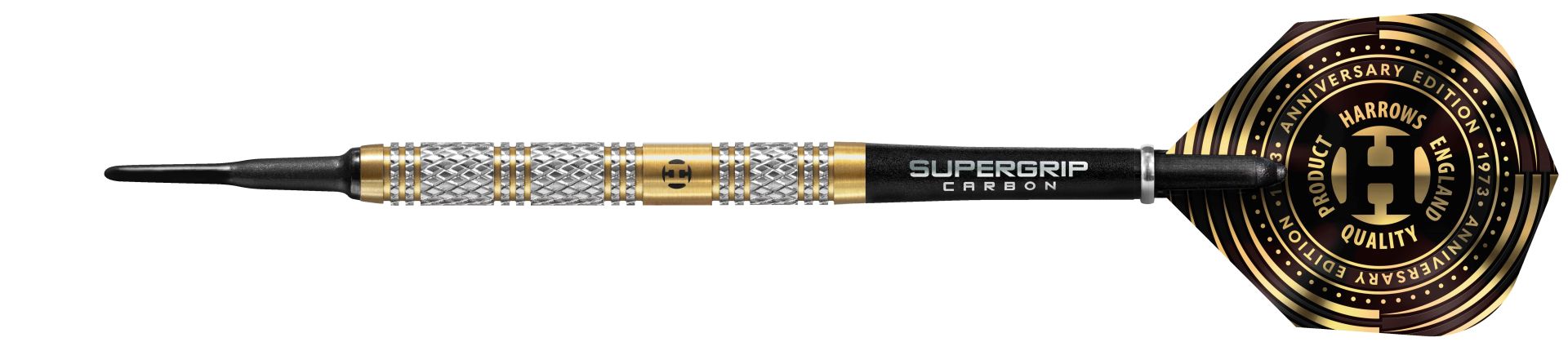 Šipky jsou osazeny karbonovými násadkami Midi Supergrip a jubilejními 100mikronovými letkami Harrows Anniversary, které jsou potaženy odolným zlatým nitridem titanu.
