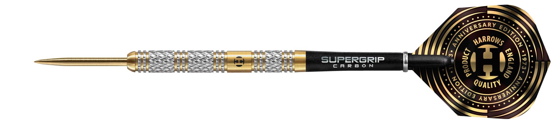 Šipky jsou osazeny karbonovými násadkami Midi Supergrip a jubilejními 100mikronovými letkami Harrows Anniversary, které jsou potaženy odolným zlatým nitridem titanu.