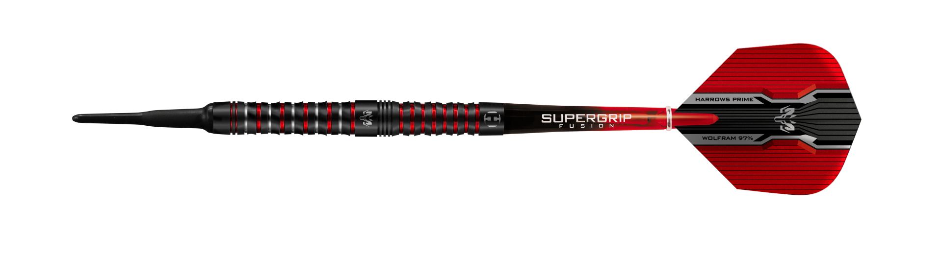 Barely šipek Wolfram Infinity 97% jsou doplněné násadkami Black/Red Midi Supergrip Fusion a novými letkami Prime.