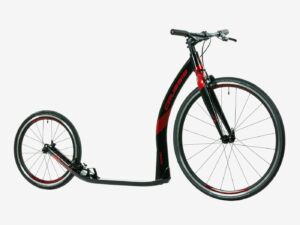 Přední kolo má stejný průměr jako běžná silniční kola 28“, zadní je 20“. Roadka je obutá na kvalitních pláštích SCHWALBE Durano s velmi nízkým valivým odporem. Velice účinné brzdy TEKTRO, které se běžně používají v silniční cyklistice, jsou navíc vybaveny integrovaným zvonkem. Koloběžka je velmi rychlá a perfektně ovladatelná při průjezdu zatáčkami. Není tedy nač čekat.. Obujte boty a šlápněte do toho!