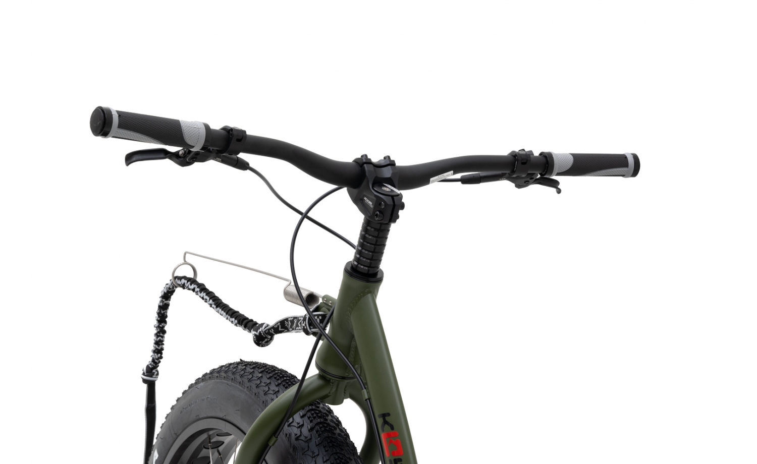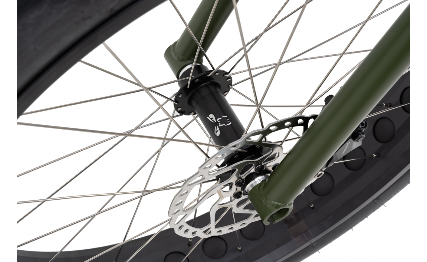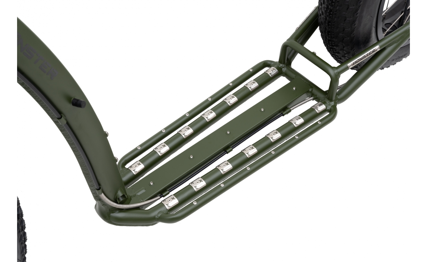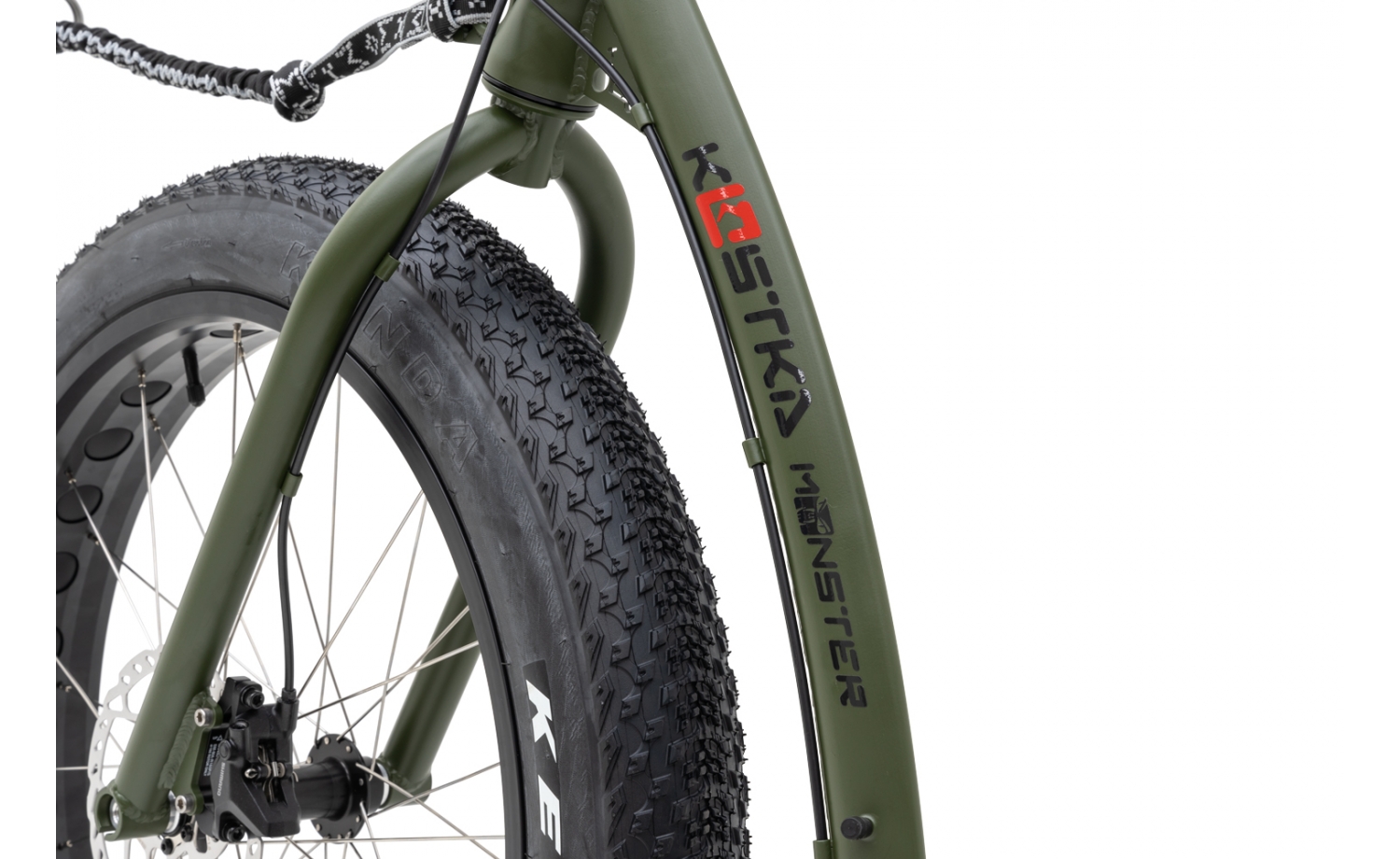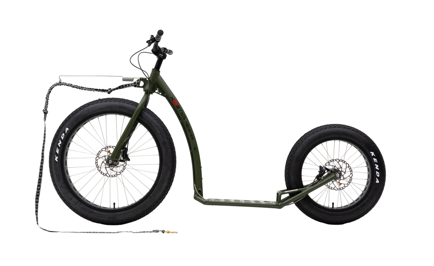 Koloběžka s označením „terénní“ by měla projet téměř všude. Existuje ale model, který se nezastaví před jakýmkoliv terénem – Kostka Monster. Ten byste mohli znát už z dřívějška, ale protože vývojový tým naší firmy pracuje v režimu 24/7, můžeme vám nyní představit nový model – Kostka Monster Max Dog (G6) – „fatkoloběžka“ připravená pro jízdu s vaším psím parťákem nebo klidně i dvojicí neúnavných tahounů. Jezdit na Monstru můžete samozřejmě i sami. Čivavu nebo jorkšíra nechte raději doma, a vyražte na nejbližší pump track či horské traily. Bajkeři neuvěří a raději vás budou pouštět před sebe. Stvořili jsme monstrum… Kostka Monster Max Dog (G6) si ponechal to nejlepší z původního Monstra, aby navíc přinesl skvělé inovace. Velké změny se odehrály u přední vidlice. Ta je zesílená a uložená v tapered hlavovém složení, takže koloběžka doznala citelně vyšší tuhosti. Aby toho nebylo málo, upravili jsme také geometrii pro stabilnější jízdní projev a lepší odezvu řízení. K vyšší tuhosti celkové konstrukce přispělo také vyztužení rámu v oblasti nášlapné plochy, která je ve verzi Dog po obou stranách rozšířená. Uprostřed nášlapu jsou navíc nově šroubovací piny, takže patřičný grip pro vaše boty je zajištěný v každém počasí. Ty velké černé kruhy vážně nejsou plováky. Čtyřpalcové fatbikové pláště fungují podobně jako pásy tanku – jejich plocha se po terénu „rozlije“, takže vás nedostane ani hluboké bahno, čerstvý sníh, nebo sypký povrch, ať už se jedná o naplaveniny českých řek nebo mořskou pláž. Protože kola patří mezi nejdůležitější komponenty koloběžky, zaměřili jsme se také na úpravy nábojů vlastní konstrukce Kostka. Nové vnitřní uspořádání umožnilo použít ložiska většího průměru, která lépe odolávají nejtvrdšímu nasazení v těžkém terénu. Používáme bezúdržbová japonská průmyslová ložiska NTN. Pevné osy vlastní konstrukce o velkém průměru 12 mm jsou pak dalším prvkem, zvyšujícím jak celkovou, tak i torzní tuhost rámu koloběžky Kostka Monster Max Dog (G6). Jediné, co pruží, jsou baňaté pláště, a ty to jaksi mají v popisu práce. Ať už budete využívat „služeb“ tažných psů, nebo se hodláte sami pouštět dolů po horských trailech, musíte mít k dispozici spolehlivé brzdy. Kotoučové hydraulické brzdy, jakožto jediná správná volba pro tuto koloběžku, pochází z dílen japonského Shimana – jde se o osvědčený typ Shimano Deore se 180mm kotouči. Lehké oversize vlaštovky čili bajková řídítka s šířkou 720 mm, opatřená protiskluzovými gumovými gripy, jsou uložena v krátkém extrémně tuhém představci, který zároveň s novou úpravou geometrie činí řízení lehce a přesně ovladatelným v jakémkoliv terénu. Musherská verze Dog je vybavená držákem pro vodítko psa, integrovaným na hlavové trubce pod řídítky. S koloběžkou se dodává jednoduše odnímatelný adaptér vodítka z pružinové oceli, plus vodítko s amortizérem. Vodítko splňuje normy, předepsané českými i mezinárodními svazy – díky tomu můžete hned po vybalení nového stroje z krabice vyrazit se svým psím tahounem na musherské závody. Slovo na konec? Novému Monstru v tmavě zelené barvě Army Green jednoduše nejde odolat! 🙂