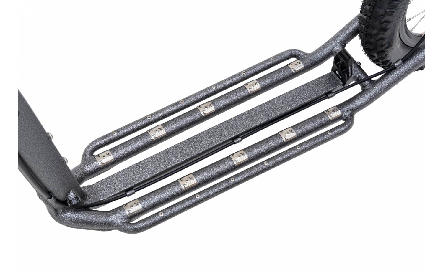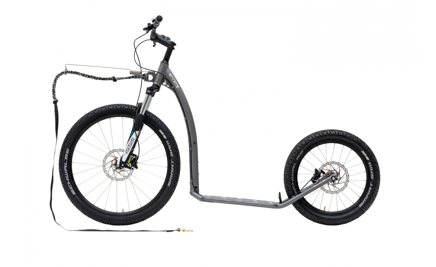 „Menší brácha Mushing Raceru Pro (G6)“ – tak by se dal nazvat terénní musherský model s koly 26×20", vybavený přední odpruženou vidlicí. Ne každý potřebuje námořní koráb, mnozí si vystačí s rychlým a obratným sportovním člunem, který vás – nebo lépe vás a vašeho psa – spolehlivě provede členitým terénem. Často skloňovaným slovem u koloběžek, které mají, na rozdíl od kol, otevřený rám, je tuhost. Ta jde zvláště v případě terénních či musherských modelů ruku v ruce s celkovou pevností a odolností. Mushing Max šesté generace dostal okem sice téměř nepostřehnutelné, nicméně pro celkovou tuhost koloběžky významné zpevnění nášlapné plochy. Pro lepší postoj v těžkém terénu a při velké rychlosti, je nášlapná plocha také rozšířená. Díky tomu můžete stát naprosto bezpečně a pohodlně s oběma nohama vedle sebe. Nový je také frézovaný hliníkový doraz/chránič paty, kterému kromě vlastní funkčnosti nechybí ani jistý designový potenciál. S vyšší tuhostí se pojí i nové semiintegrované hlavové složení, v němž je uložená přední odpružená vidlice se zamykáním odrpužení. Díky tomu se můžete pustit i do nejobtížnějšího terénu, aniž byste ztratili kontakt předního kola s povrchem, nebo snad za vámi létaly jiskry od stupátka, brousicího kameny na cestě. O správný kontakt s terénem se pak samozřejmě starají pláště – v případě Mushing Maxu G6 jsou to osvědčené Schwalbe Smart Sam, které vás podrží na jakémkoliv povrchu. K jistému řízení přispívají nízké oversize MTB vlaštovky s polotuhými gripy pro pevný úchop. Koloběžka určená do terénu vyžaduje kvalitní kotoučové brzdy. Naše firma vsází na japonské Shimano, a samozřejmě jde o hydraulické brzdy s kotouči. Však to znáte sami – když váš pes nasadí tempo, ohled na pána na stupátku za sebou zrovna nebere. Takže občas je na brzdy třeba sáhnout ostřeji. Ale ať už jde jen o snížení rychlosti, nebo bezpečné zastavení „ze sta na nulu“, ani jedno, ani druhé nečiní Mushing Maxu G6 žádný problém. Pro správnou synergii s vaším psím parťákem je tento model vybavený držákem pro vodítko a adaptér čili „tykadlo“, integrovaným na hlavové trubce pod řídítky. Jak jednoduše odnímatelný adaptér vodítka z pružinové oceli, tak i vodítko s amortizérem jsou součástí standardní výbavy této koloběžky. Vodítko splňuje normy, předepsané českými i mezinárodními svazy – díky tomu můžete vyrazit se svým psím tahounem klidně i na musherské závody. Ať už rychle nebo obezřetněji, se psem či bez něj, s koloběžkou KOSTKA Mushing Max (G6) je to v terénu vždy skvělý zážitek, který byste si neměli nechat ujít!