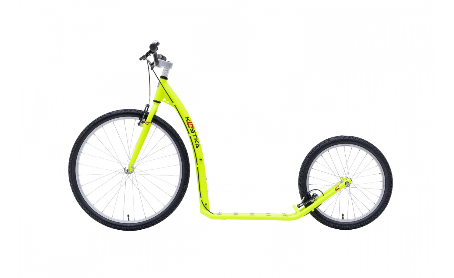 Koloběžka s velkými koly, pro začátečníky Pokud s koloběhem teprve začínáte, a nejste si proto úplně jisti, zda vás tento sport chytne a nepustí (věříme, že ano), je koloběžka KOSTKA TOUR FUN správná volba. Na to, jaké možnosti nabízí, je totiž poměrně levnou koloběžkou pro dospělé. Jsme si 100% jistí, že od ní dostanete přesně to, co jakožto začínající koloběžkách potřebujete. Její konfigurace totiž rozhodně není nijak ošizená. Koloběžka TOUR FUN stojí na velmi kvalitním rámu, který je optimalizován pro příjemnou a pohodovou jízdu. Pohoda, klídek, koloběh, to je oč tu koloběží… Podobně jsou na tom jednokomorové ráfky, nazuté do plášťů Mitas, na kterých si zkrátka a dobře ujedete. Ale abyste si neujeli zase až moc, můžete kdykoliv zpomalit za pomocí účinných véčkových brzd Promax. Nášlap této koloběžky s velkými koly 26"/20" je ze spodní strany opatřen výztuhou a speciálními sváry, které zpevňují rám a zároveň chrání jeho nejvíce namáhaná místa při styku s nerovnostmi. Až budete chtít koloběžce ukázat vzdálenější destinace, jistě oceníte, že náboje kol disponují rychloupínacím systémem upevnění osy. Díky tomu je možné kola snadno a rychle odmontovat, a váš stroj tak snáze naložit do kufru automobilu. Jak jsme slíbili na začátku, koloběžka pro dospělé KOSTKA TOUR FUN je zkrátka výborný stroj za přijatelnou cenu, který do puntíku splní vaše očekávání. Odrazte se vstříc objevování krás koloběhu a světa, jenž nás obklopuje. Určitě této vášni zcela podlehnete.