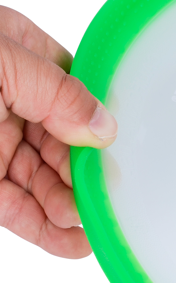 Létající talíř Superdisc má na vnitřní úchopové straně měkčené protiskluzové výstupky (gripy), při hodu tak pevně sedí v ruce.