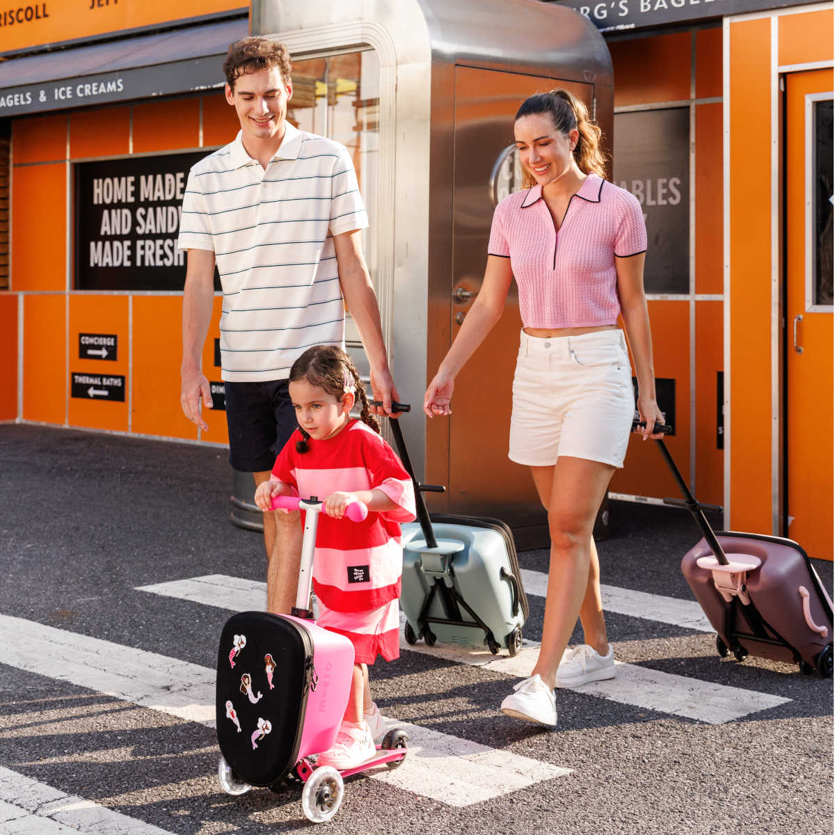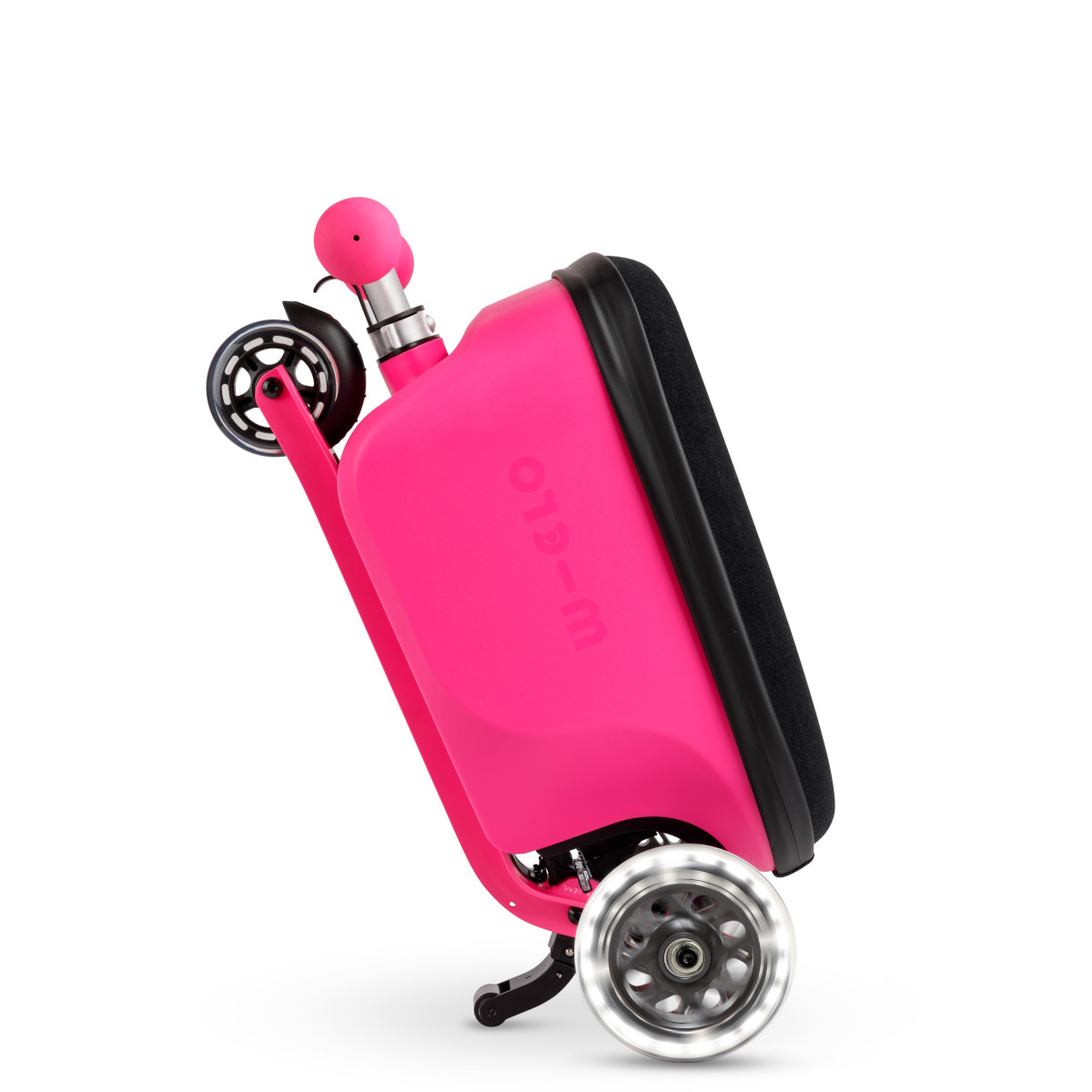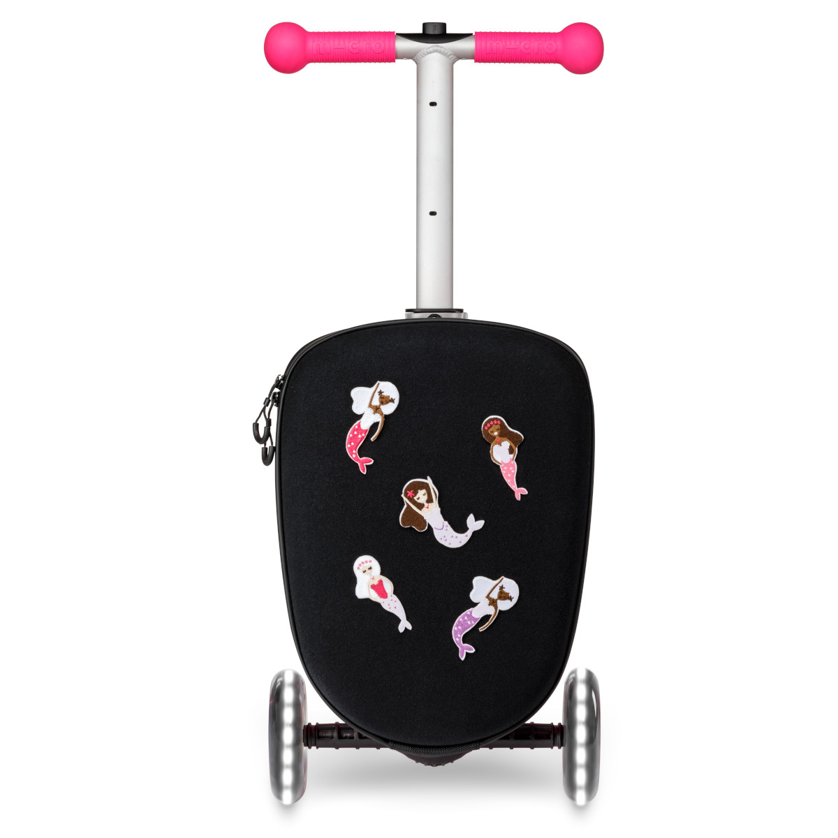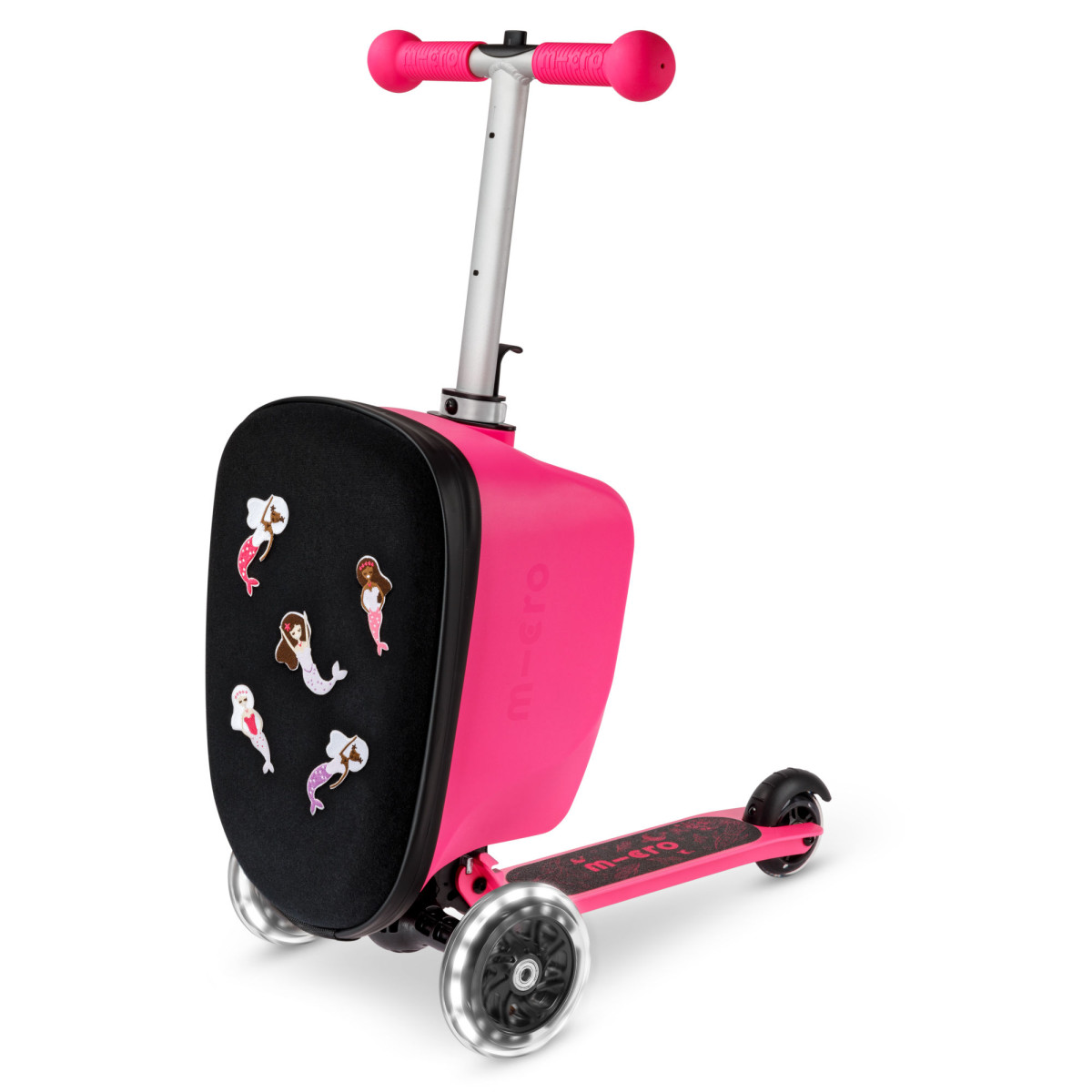Růžová koloběžka a kufr v jednom s kreativní výzdobou. Zábavný a praktický společník na cesty pro holčičky od 2 do 6 let. Styl, funkce a radost v pohybu.