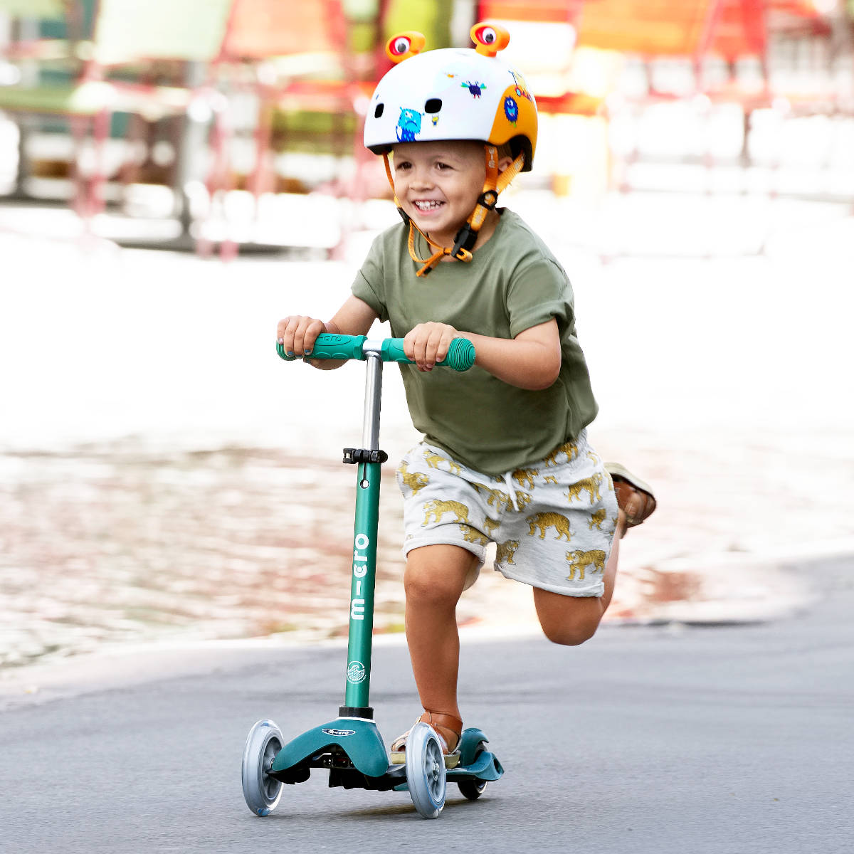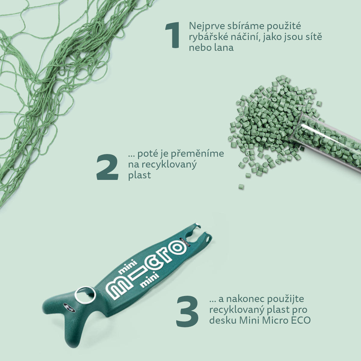 Mini Micro Deluxe ECO green je koloběžka ideální pro děti od 2 let. Koloběžky z řady ECO jsou šetrné k přírodě – vyrobené z recyklovaného plastu, který pochází z rybářských sítí vylovených z moře. Speciální konstrukce koloběžky, typická pro všechny modely Mini Micro Deluxe, pomáhá rozvíjet rovnováhu a koordinaci pohybů.