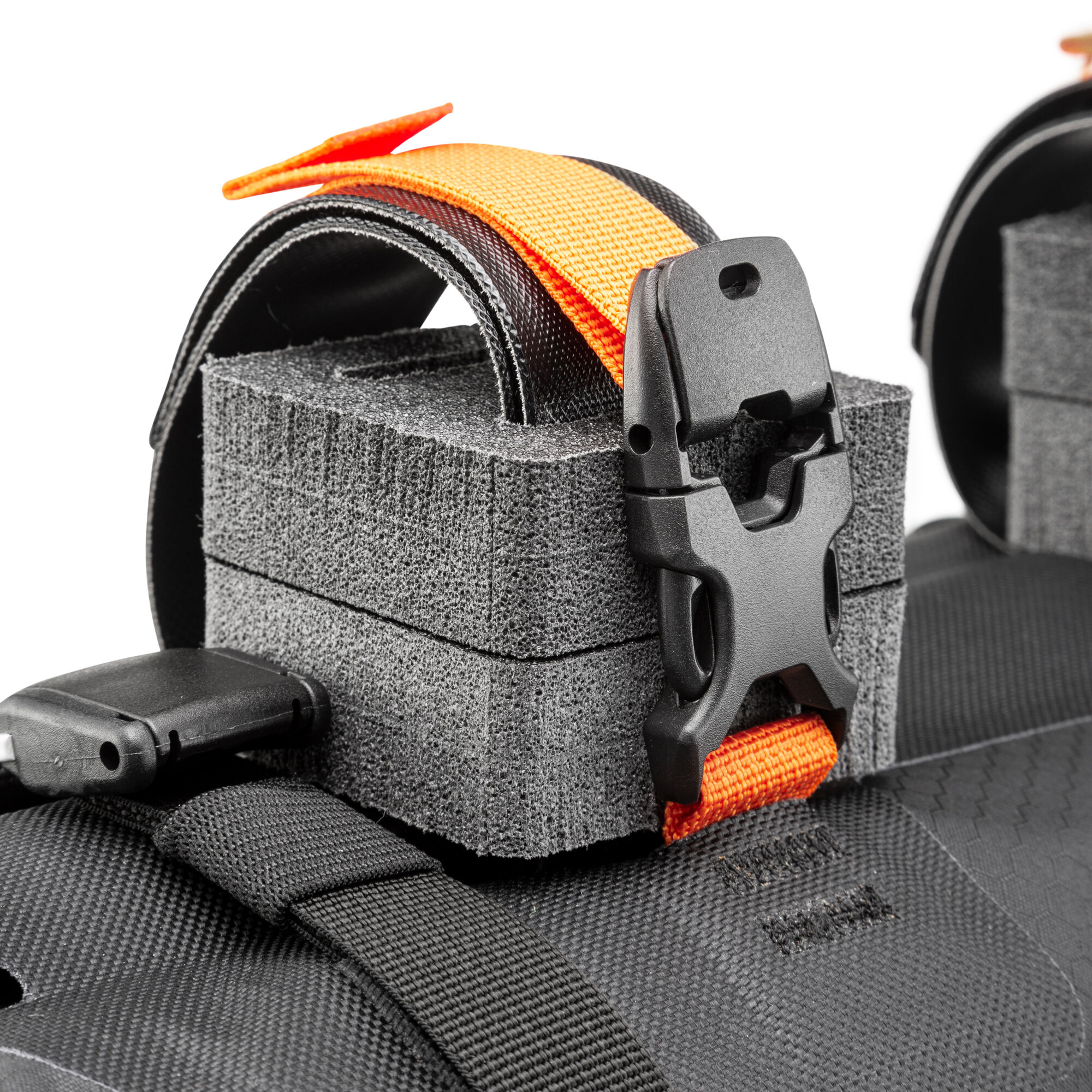 Kromě toho je brašna na řídítka vybavena čtyřmi háčky, které umožňují připevnit brašnu ORTLIEB Accessory Pack a získat tak další úložný prostor. Montážní systém, který se skládá z distančních prvků a dvou pevných pásků na suchý zip, zajišťuje bezpečné upevnění na jakýkoli typ řídítek, včetně karbonových. Vyztužený vnitřek batohu a upevnění na hlavové trubce poskytují dodatečnou stabilitu v jakémkoli terénu.