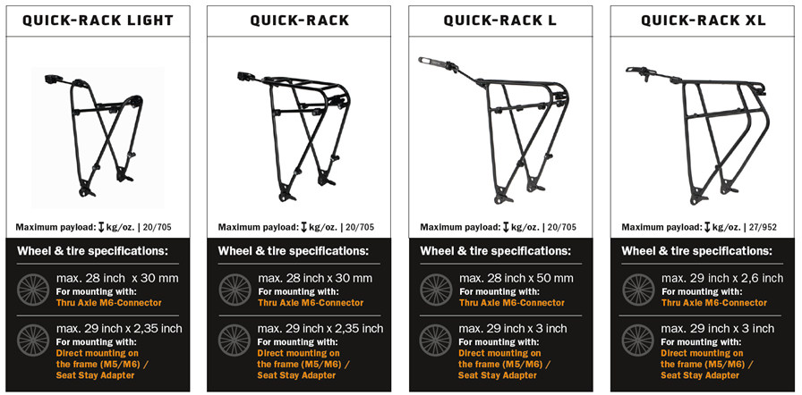 Vzpěry o průměru 10 mm udrží užitečné zatížení až 20 kilogramů. Quick Rack je samozřejmě vhodný pro použití se všemi brašnovými systémy ORTLIEB, takže jej můžete kombinovat s jakoukoliv brašnou ORTLIEB . Díky dvěma závěsným úrovním a plošině můžete zároveň používat a upevnit brašny i košík. Volitelné blatníky zajistí, že zůstanete v suchu a čistotě i za špatného počasí.