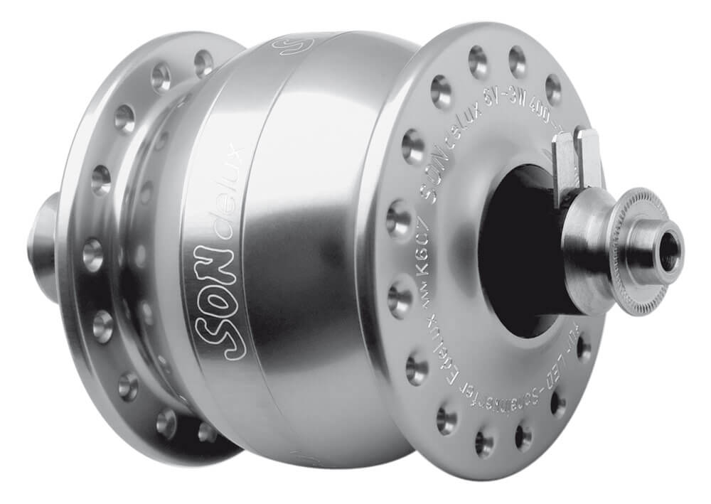 Už mnohokrát jste se jistě dostali do situace, že se začalo stmívat a vy jste se ocitli na kole bez blikačky, nebo s vybitými bateriemi. Případně pokukujete po moderních technologiích jako jsou GPS, mobilní telefony, foťáky a kamery, které potřebují být stále nabité. Ale kde se na dlouhých cyklistických cestách dostat k potřebné elektrické energii? Odpovědí může být právě SON. Německý a v Německu vyráběný SON je definitivně nejlepší dynamo na světě. Vyniká především nízkým odporem a velkým výkonem. Pokud jsou světla vypnutá, jeho odpor je tak minimální, že jej ani nerozeznáte. Ve 30km/h Vás zbrzdí jen o 0,1 km! Se zapnutými světly pak budete pomalejší o pouho pouhých 0,7 km/h. S dynamem SON, které non-stop napájelo dvě přední světla, projela celou svou trasu expedice Hamé Nordkapp – Gibraltar non – stop ride v roce 2007.
