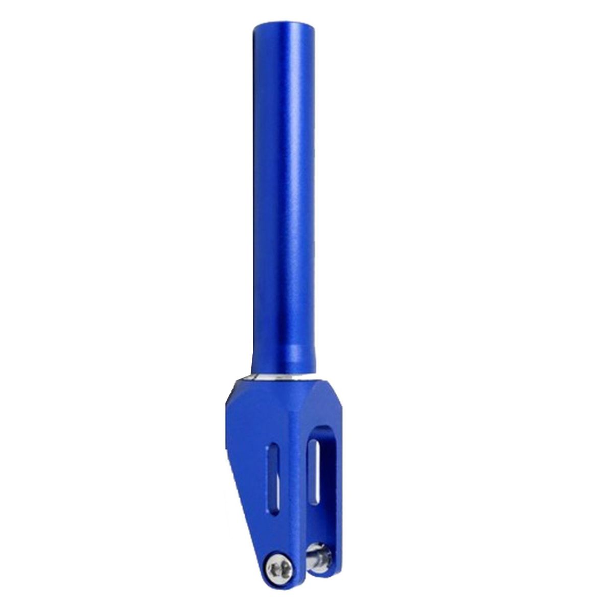 Jednodílná bezzávitová tmavě modrá hliníková přední vidlice na freestylovou koloběžku určená pro SCS.