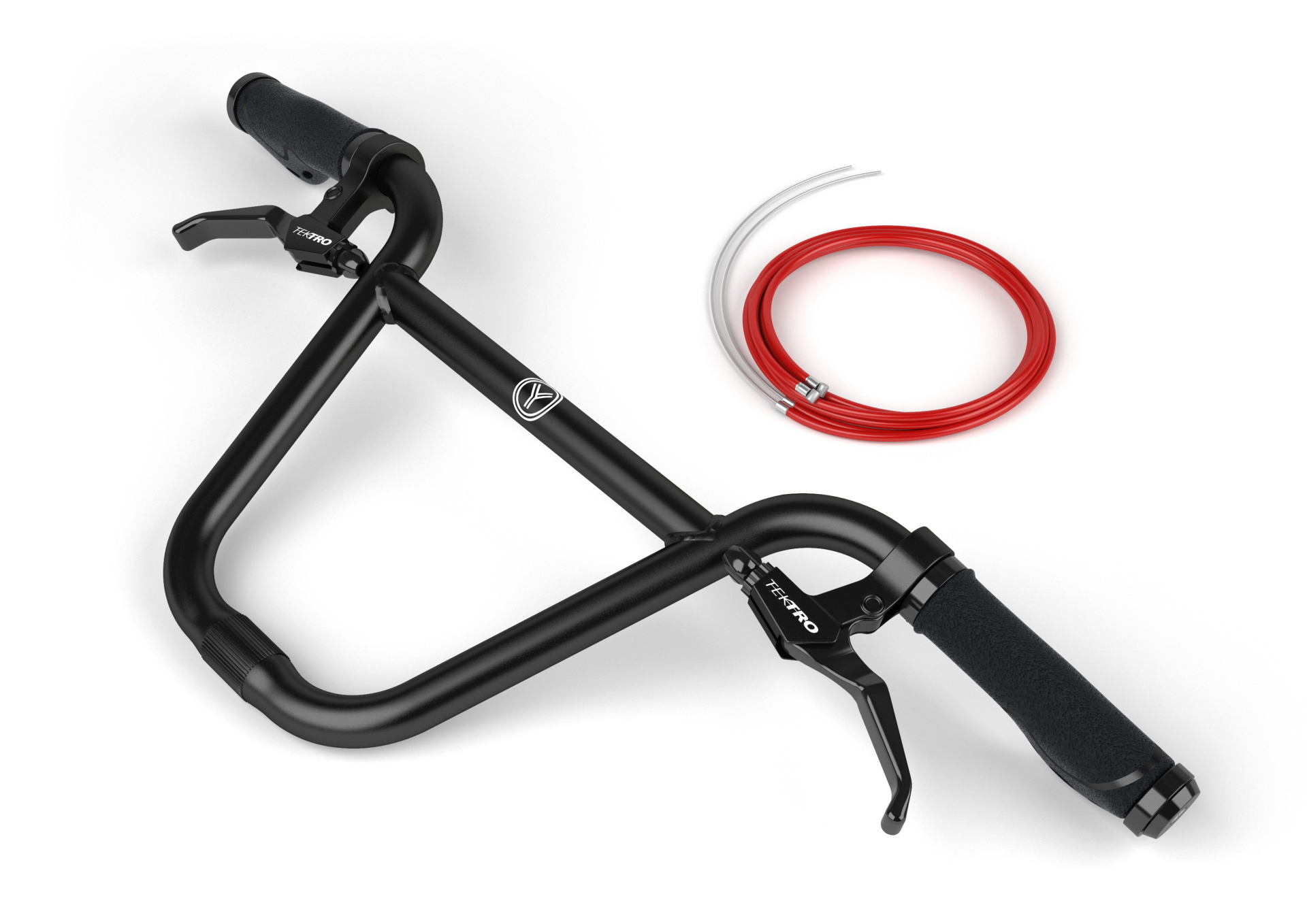 Hliníková řídítka jsou pevná a lehká. K pohodové jízdě přispějí i ergonomické gripy s dvojitou fixací proti přetočení. Součástí balení jsou i delší brzdová lanka a různě barevné bowdeny.
